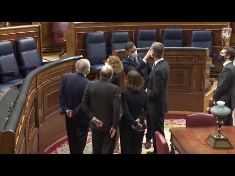 A su llegada al Congreso de los Diputados, el Rey ha sido recibido por el presidente del Gobierno, Pedro Sánchez; la presidenta del Congreso de los Diputados, Meritxell Batet; la presidenta del Senado, Pilar Llop; el presidente del Tribunal Constitucional, Juan José González Rivas; y por el presidente del Tribunal Supremo y del Consejo General del Poder Judicial, Carlos Lesmes; entre otras autoridades.